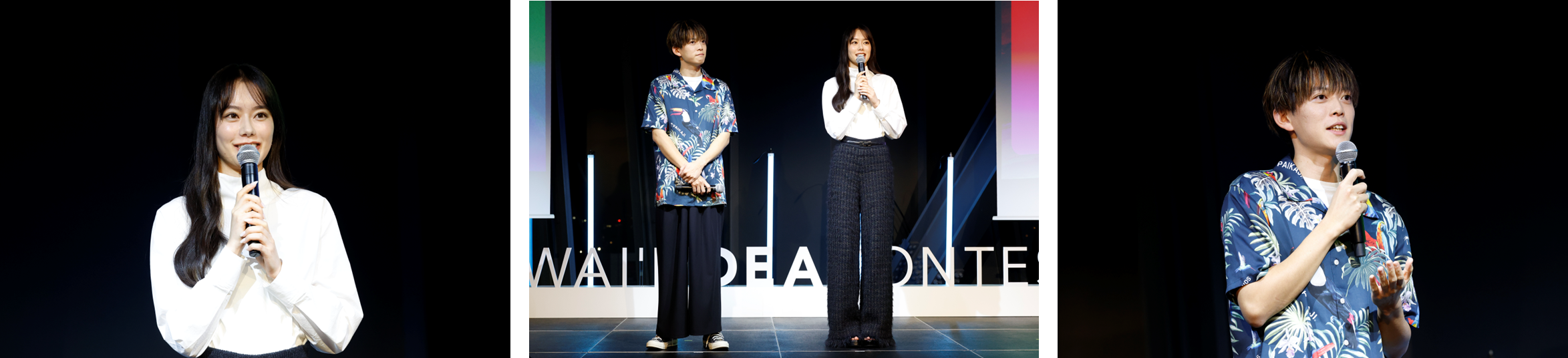 最終審査会の後半では、特別企画として審査員の松丸亮吾さんとなごみさんが“学生に負けじと”自らのハワイ旅アイデアをプレゼン。松丸さんは、謎解きをしながら観光スポットを巡る「ハワイに埋めた埋蔵金を探せ!謎解き宝探しツアー」を提案!「今行けば、こんなに面白いことをやっているらしいという話題性を作りたい」「ハワイへの理解が深まれば深まるほど、正解に近づくものにしたい」とプランに込めた想いをコメント。なごみさんは、“食べる幸せ”をテーマに、食でハワイの文化と人の温かさを感じる旅として「Hawaii Food Trip」~“おいしい”で笑顔になる旅~を紹介!「“ハワイでしか味わえない味“があるのではないかと思っています」「食を通じて五感を楽しむ旅を提案したかったです!」と語りました。ゲストの“プレゼン”に、会場からは笑いや拍手が起こり、学生たちも「まさか審査員の発表が見られるとは!」と大盛り上がり。コンテストの枠を越え、審査員と学生が同じ目線で“ハワイの魅力”を語り合う、温かな時間となりました。