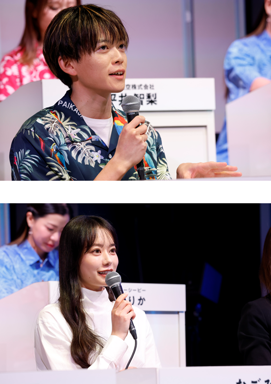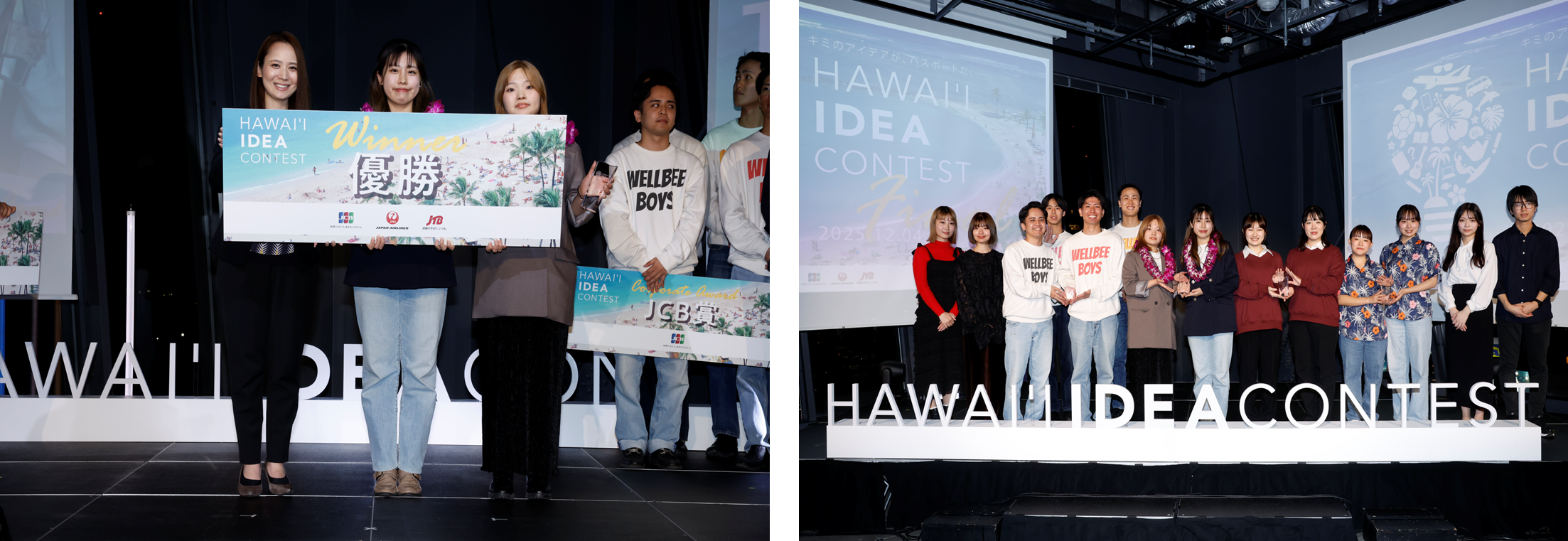 見事、優勝に輝いたのは、小学生時代からの仲だという二人組の「Team Campus Mile」。同チームは、ハワイの文化や自然を若者のライフスタイルと掛け合わせ、思わず“行きたくなる”新しい旅の形を提案しました。現地のリアルな魅力をSNS発信や体験型企画で伝えるという発想が評価され、審査員からは「卒業旅行という大事な思い出となるものを、経験や体験で更に特別なものにするというコンセプトがよかった」「体験したことを拡散していくという視点に感銘を受けた」「日本の日常生活の中で、社会貢献活動を通じてハワイを想起させる点も優れていた」との好評の声が上がりました。受賞したチームには、賞金100万円とハワイ旅行の招待、そしてJCB・JAL・JTBの3社とともに“次のハワイ旅”を共同で企画する権利が贈られました。メンバーは「まさか過ぎて、緊張しています。一緒にハワイに行って楽しんできます!」と優勝への喜びや、「自分がそうだった様に、誰かに対して海外旅行を前向きに捉えるきっかけをつくりたい」と、今後への想いを語りました。