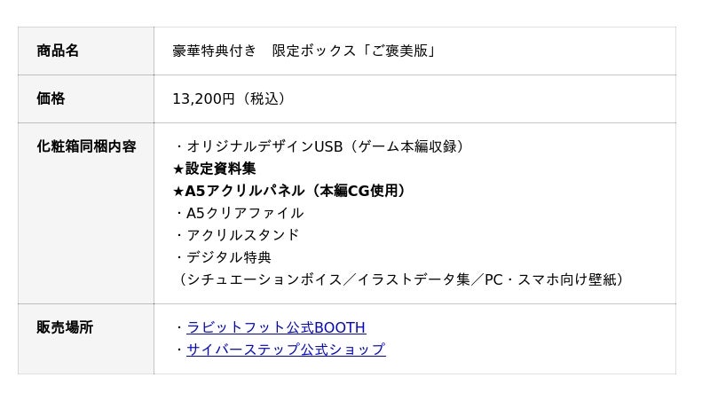 2025年10月28日(火)より『ちなみほりっく -Chinami Holic-』の限定ボックス(ご褒美版)を「ラビットフット公式BOOTH」と「サイバーステップ公式ショップ」の両公式ショップでの予約受付を開始しました。公式ショップで取り扱う本作は、センシティブなシーンを包み隠さず楽しめる「ご褒美版」となっています。「ご褒美版」は、公式サイトでのみの取り扱いとなります!