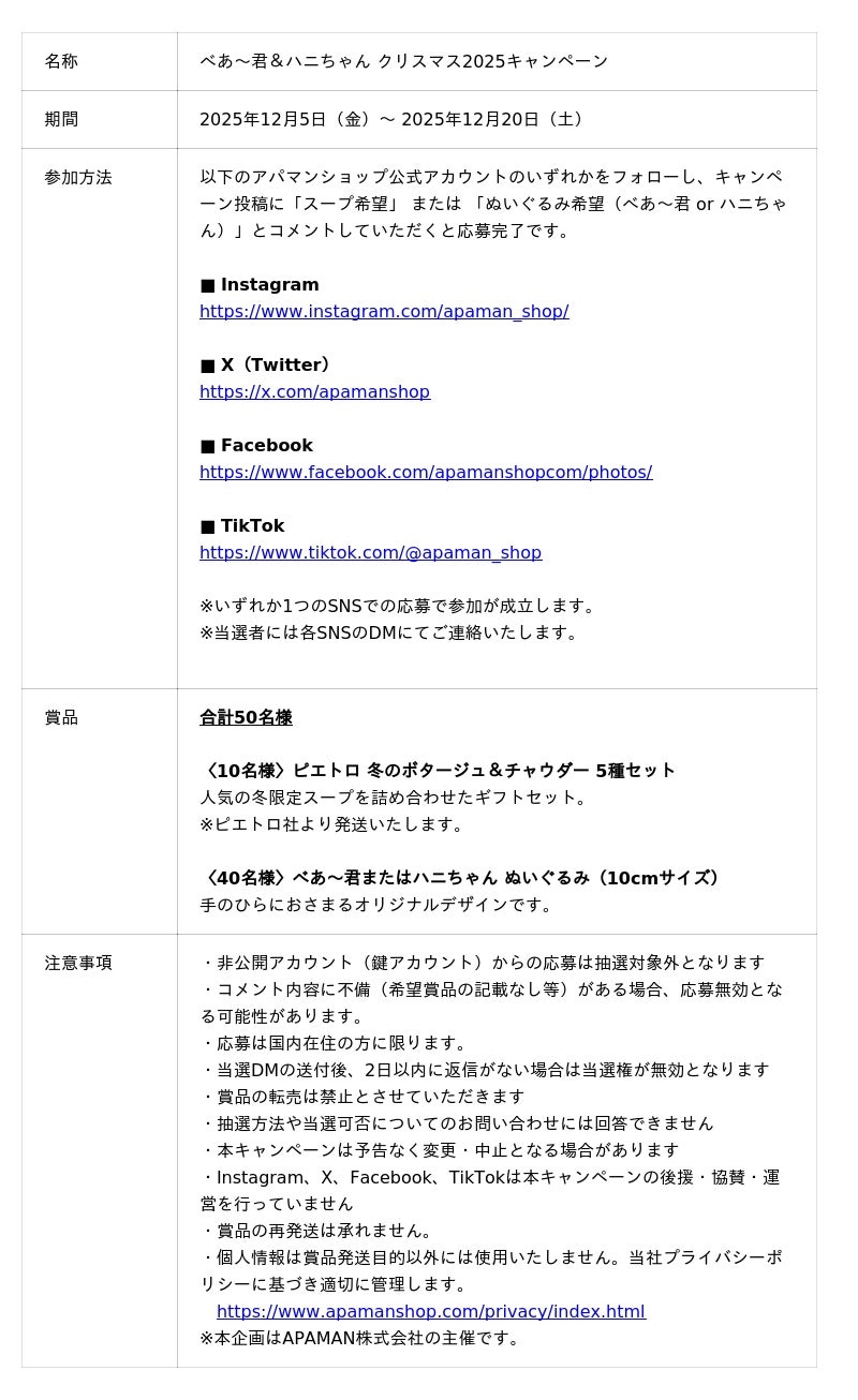 フォロー&コメントのみで応募できる手軽さが特徴で、冬に嬉しい人気スープセットや、ここでしか手に入らない「べあ~君&ハニちゃん」オリジナルぬいぐるみなど、合計50名様にプレゼントをご用意しました。