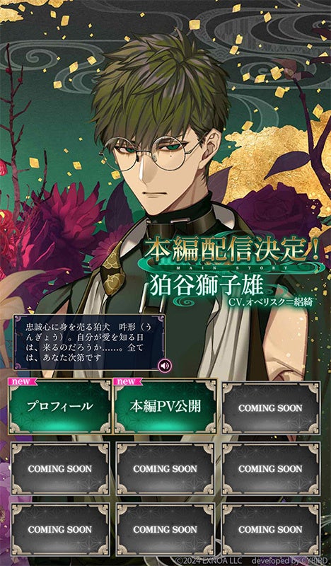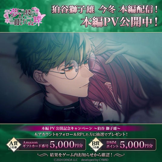 合同会社EXNOA(本社:東京都港区、CEO:東條 寛、URL:https://games.dmm.com/)が運営するDMM GAMESにおいて、Romanteen18シリーズの第1弾・オトナの女性向け恋愛ゲーム「夢幻楼と眠れぬ蝶」にて、獅子雄(CV:オベリスク=絽綺)の特設ページをゲーム内にて公開したことをお知らせいたします。また、獅子雄本編PVの公開や、公開記念のXキャンペーンが開催されたこともお知らせいたします。