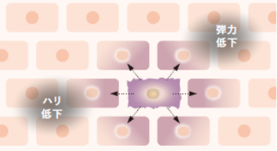 近年の臨床研究により、年齢を重ねた肌の中には、活動をほとんど停止しながらも排出されずに残り続ける「老化細胞(通称:ゾンビ細胞)」が存在することが分かってきました。ゾンビ細胞は分裂は停止するものの、アポトーシス(細胞死)を起こさずに肌に留まり続け、周囲の正常な細胞に害を及ぼす物質「SASP」を放出します。代表的なSASPとして炎症性サイトカインが、周囲の細胞や組織に微弱な炎症を与え続けることで、肌のハリ・弾力低下を引き起こすと言われています。このようにして、ゾンビ細胞は、周囲の細胞・組織にダメージを与え、肌老化を促進すると言われています。