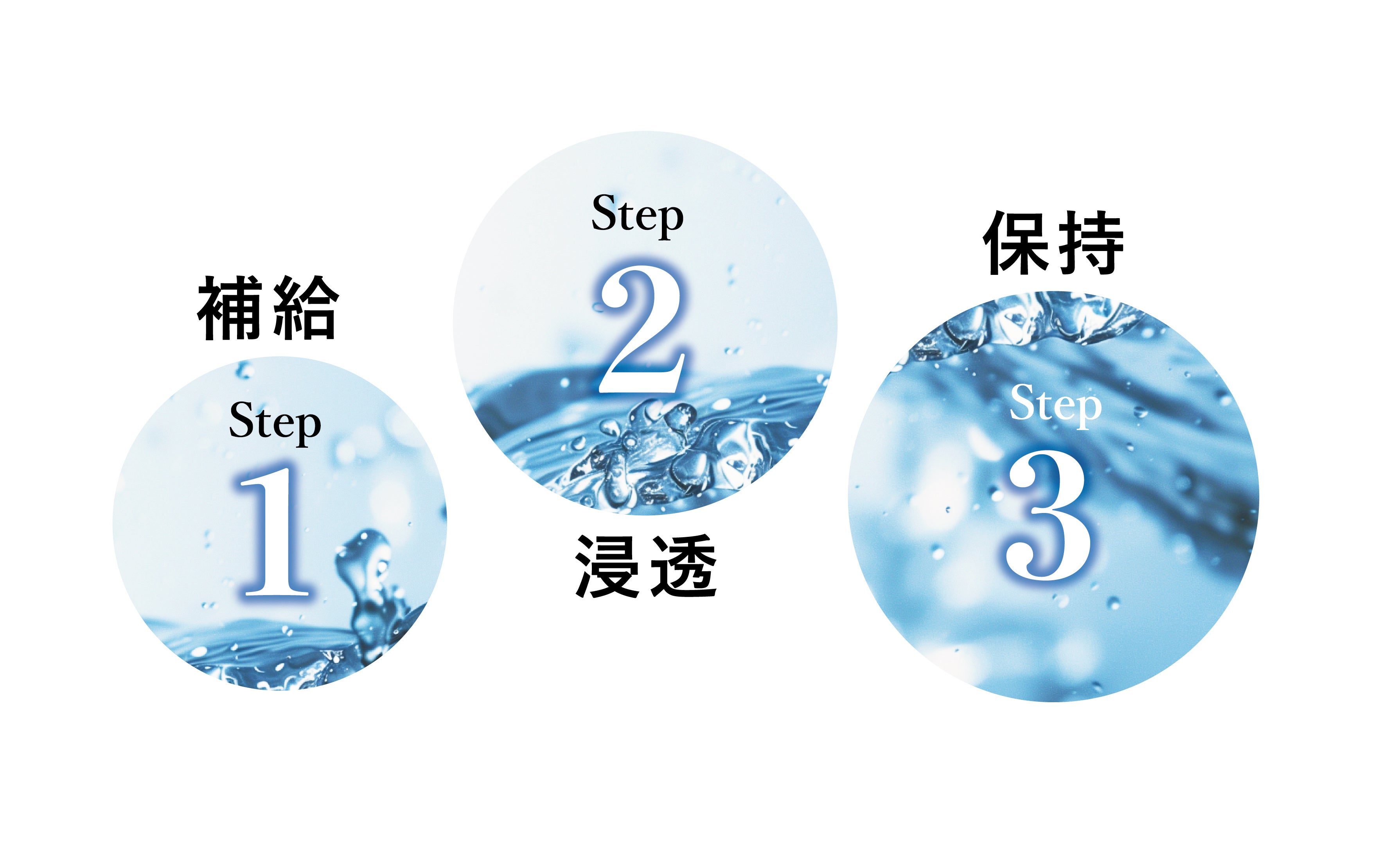 エイジングによってうるおいが失われやすい肌を多層的にサポートするため、保湿成分の浸透経路と保持機能に着目した3ステップ処方を採用しました。