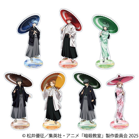 新商品は、和装姿の渚や業たち7人の描き下ろしイラストを使用した「アクリルスタンド」や「キャラバッジコレクション」などをラインナップ。さらに、殺せんせー、律、糸成の3人を加えた計10人のデフォルメイラストが楽しめる「ステッカー」や、殺せんせーの触手が長く伸びたデザインの「殺せんせーの触手定規」などもございます。
