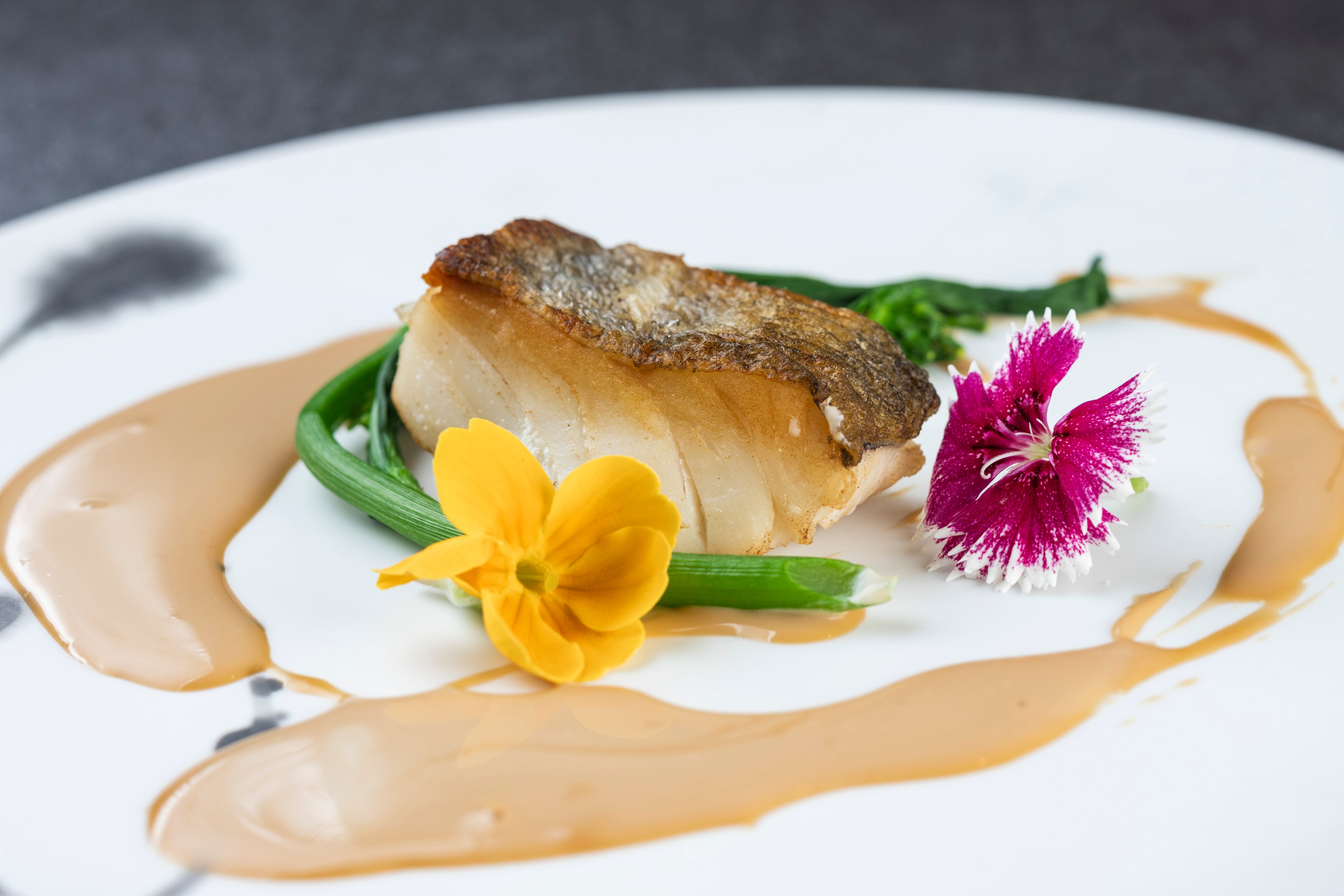 鯛のポアレ:焦がしバターのクリームパソース安曇野野菜を添えて