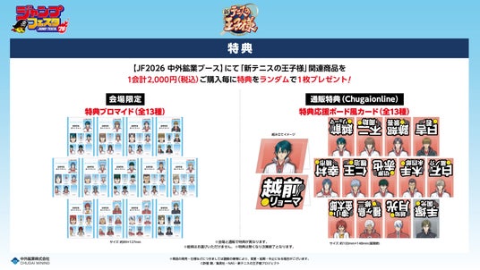 中外鉱業コンテンツ部ECサイトにてアニメ『新テニスの王子様』JF2026関連商品を1会計2,000円(税込)ご購入毎に、特典応援ボード風カード(全13種)をランダムで1枚お渡しいたします!