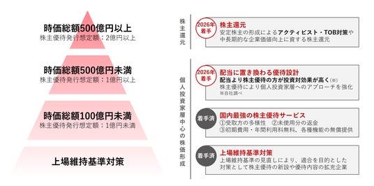 今後は、上場維持基準対策にとどまらず、配当に置き換わる優待設計や、アクティビスト・TOB対策など、中長期的な企業価値向上に資する株主還元施策の提供にも取り組みを拡大してまいります。また、これまで中心であった時価総額100億円未満の企業に加え、対象を時価総額100億円以上の企業へと拡大し、2028年までに導入企業500社・国内No.1の株主優待サービスの実現を目指します。