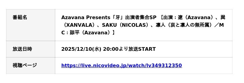 2025年12月24日に開催される Azavana 主催ライブイベント『牙』 の開催を記念した特別番組です。