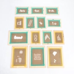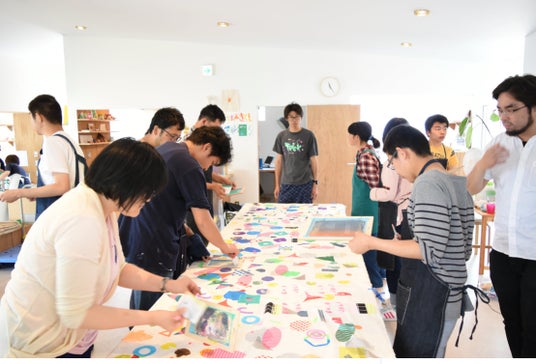 1.シルクスクリーンプリントでテーブルをかざろう!いろいろな色とたくさんの小さな版を使ってみんなで刷って、みんなで楽しむ。
