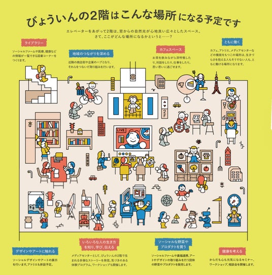 『病気を治すことで、肉体的な健康を実現し、ソーシャルインクルージョンに取り組むことで精神的、社会的な健康を目指す』。東京都済生会中央病院が掲げる使命を実践していくのが「びょういんの2階」なのです。