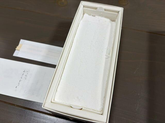 特別ギフト包装をせずとも高級感のある外箱です。賞味期限は購入日を含めて4日。また冷蔵商品なので、持ち運び時間に合わせて保冷剤をつけていただきました。