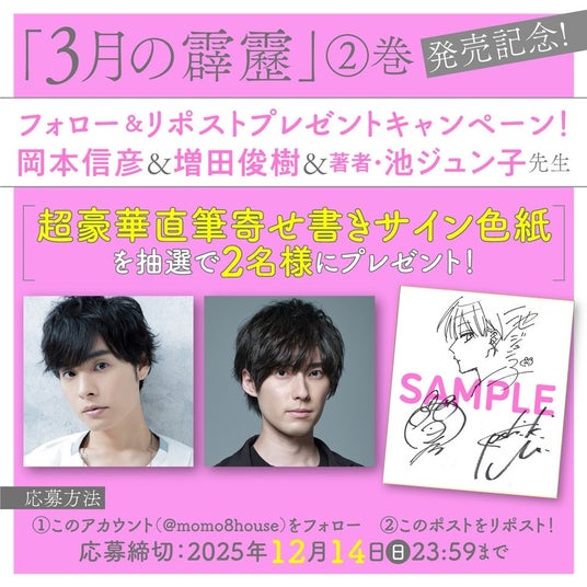 HC「3月の霹靂」2巻発売を記念して、岡本信彦と増田俊樹、さらに著者・池ジュン子の超豪華寄せ書きサイン入り色紙を抽選で2名様にプレゼント!