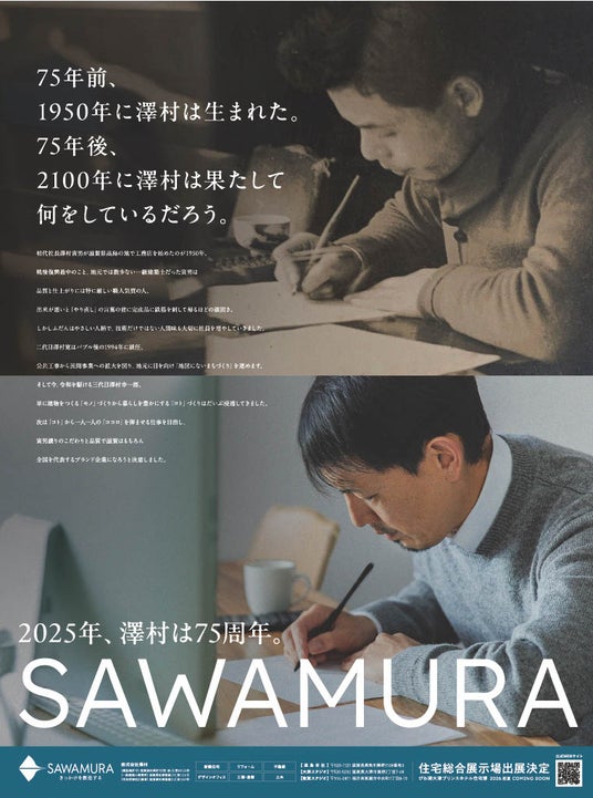 株式会社澤村(本社:滋賀県高島市、代表取締役社長:澤村 幸一郎)は、2025年12月6日に創業75周年を迎えます。それに伴う記念企画として、創業精神を振り返り、次の75年を見据えた企業姿勢を伝える新聞広告を出稿いたします。これまで支えていただいた皆さまへの感謝と、これからも“ゆたかな働き方・暮らし方ができる社会”をつくりたい、という当社の想いを発信するものです。