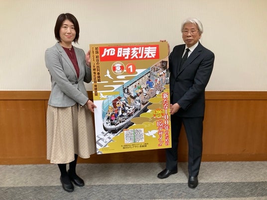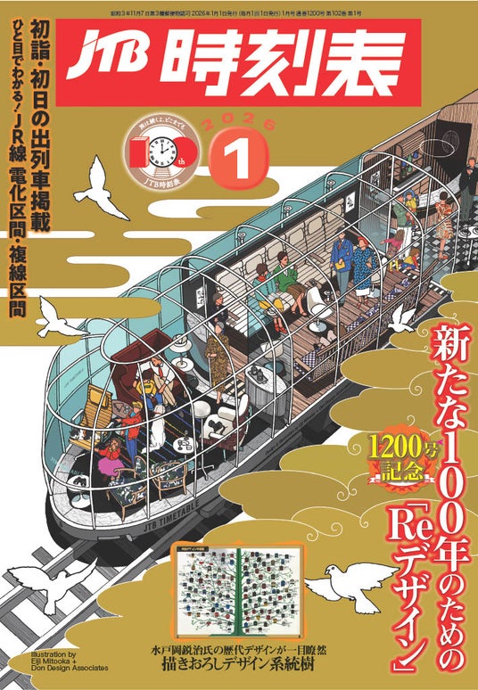 JTBグループで旅行・ライフスタイル情報を提供する株式会社JTBパブリッシング(東京都江東区、代表取締役 社長執行役員:盛崎宏行)が発行する『JTB時刻表』は、2025年12月19日(金)発売の2026年1月号で通巻1200号を迎えます。記念号となる本号では、数々の人気観光列車などのデザインを手掛ける水戸岡鋭治さんによる描き下ろしイラストが表紙を飾ります。また、創刊100周年と通巻1200号の節目に合わせ、37年親しまれてきた誌名ロゴをリニューアル。2025年12月6日(土)に行われた「JTB旅行文化講演会」では、発売に先駆けて1200号記念表紙と新しい誌名ロゴを初公開しました。