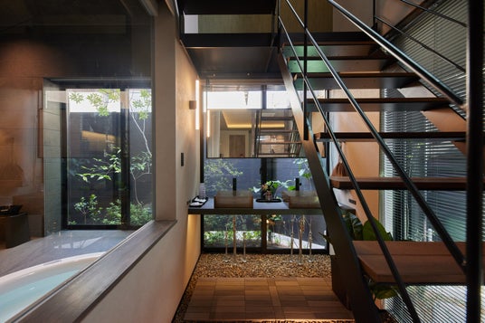 1階には、ガラス張りの空間が心地よい開放感を生む洗面スペースを配置。ダブルボウルの洗面台を備えているため、グループやファミリーでの滞在でも支度がスムーズに行えます。足元にはタイルや石材を組み合わせた仕上げを採用し、自然素材の質感が空間全体のアクセントとなっています。