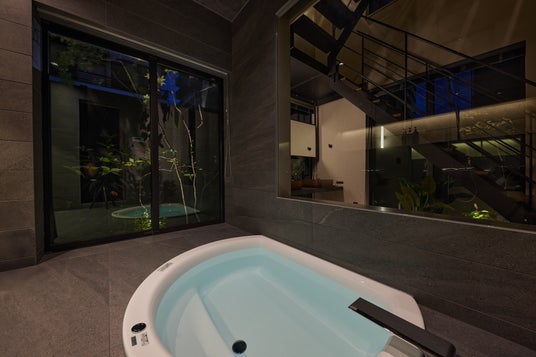 リビング横には、埋め込み型のバスタブを備えたバスエリア。半円状のデザインが空間に柔らかさを添え、ゆったりとした入浴時間を演出します。シャワーは2台設置されており、グループ滞在でも快適に利用可能です。