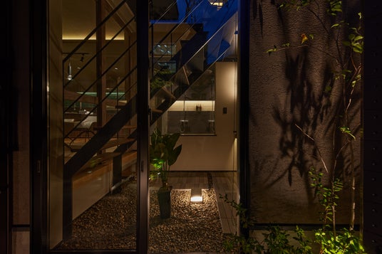 夜になると、足元に仕込まれたライトが柔らかく灯り、昼とは異なる印象に。洗面台背面のガラス越しに見える木々がライトアップされ、幻想的な雰囲気を演出します。日中の清々しさと、夜のしっとりとしたムードを両方楽しめる、こだわりのデザインスペースです。