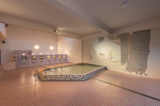内風呂にも色とりどりのタイルアートを貼り分けています。