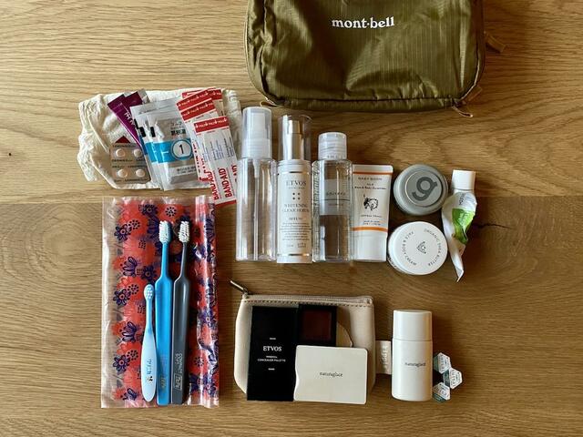 左下から時計回りに、歯ブラシ、もしものときの薬類。それと、スキンケア&ヘアケア類、最低限のメイク用品。