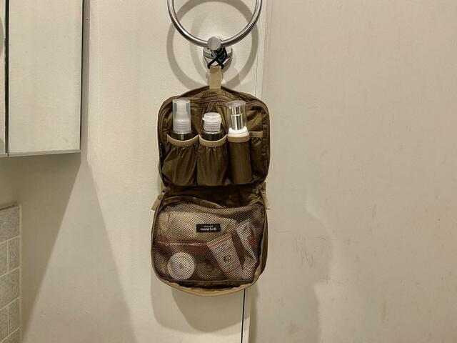 宿によっては洗面台が狭かったり、ユニットバスでポーチの置き場がなかったりもするので、吊るせるだけで本当に快適ですよね。