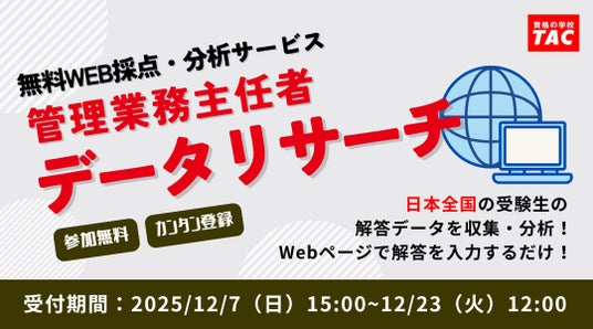 TAC株式会社(東京都千代田区、代表取締役:多田敏男)は、12/7(日)実施の『令和7年度 管理業務主任者試験』の解答速報をTACサイトで公開!さらに、当日『解答速報会』をYouTubeLIVE配信!