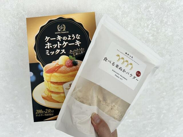 市販のホットケーキミックスに米ぬかパウダーを大さじ1程度混ぜるだけ。