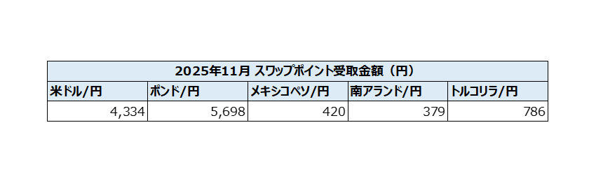 SBI FXトレード株式会社(本社:東京都港区、代表取締役社長:藤田 行生)は、2025年11月のFX取引におけるスワップポイントの実績を公表しましたことをお知らせいたします。