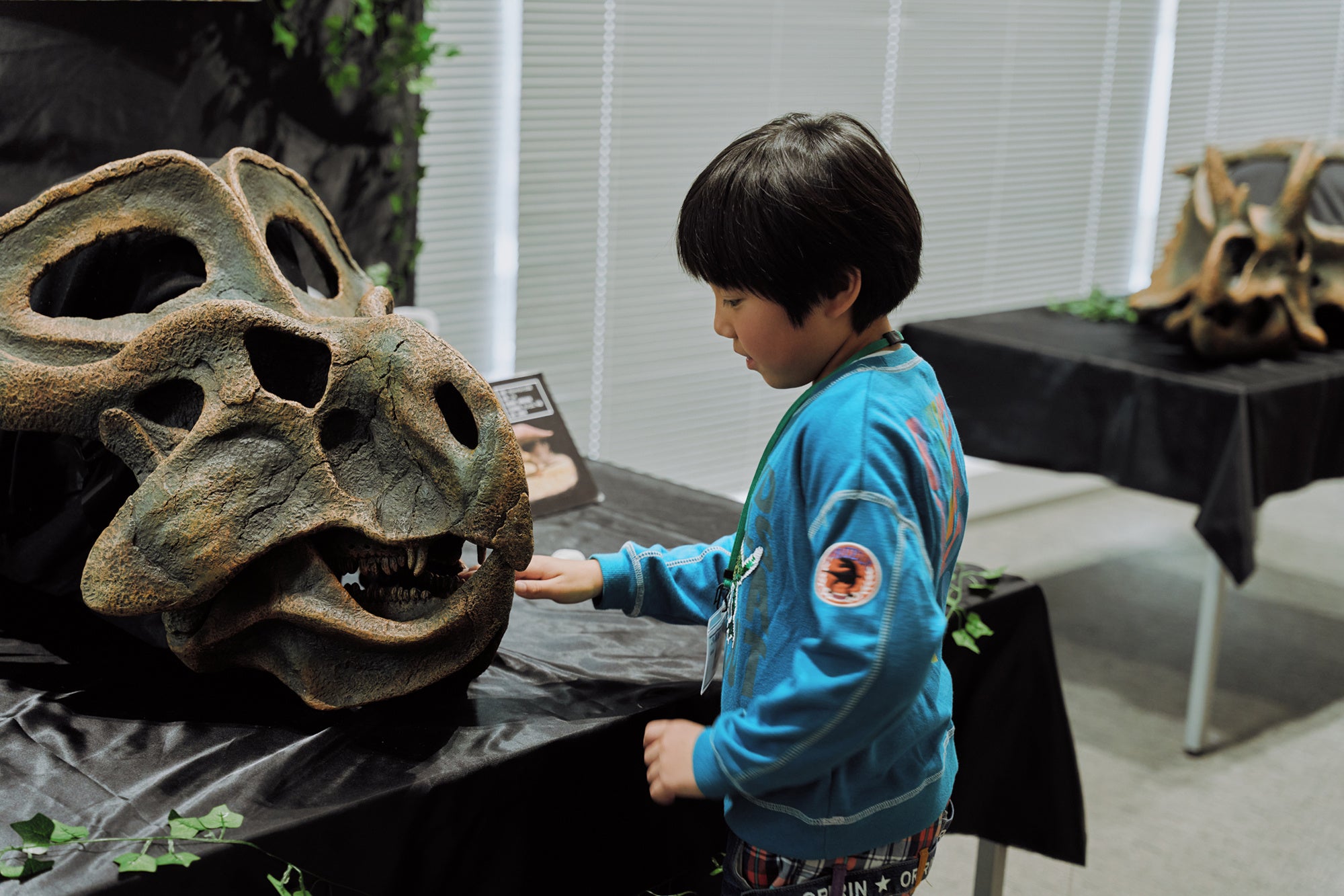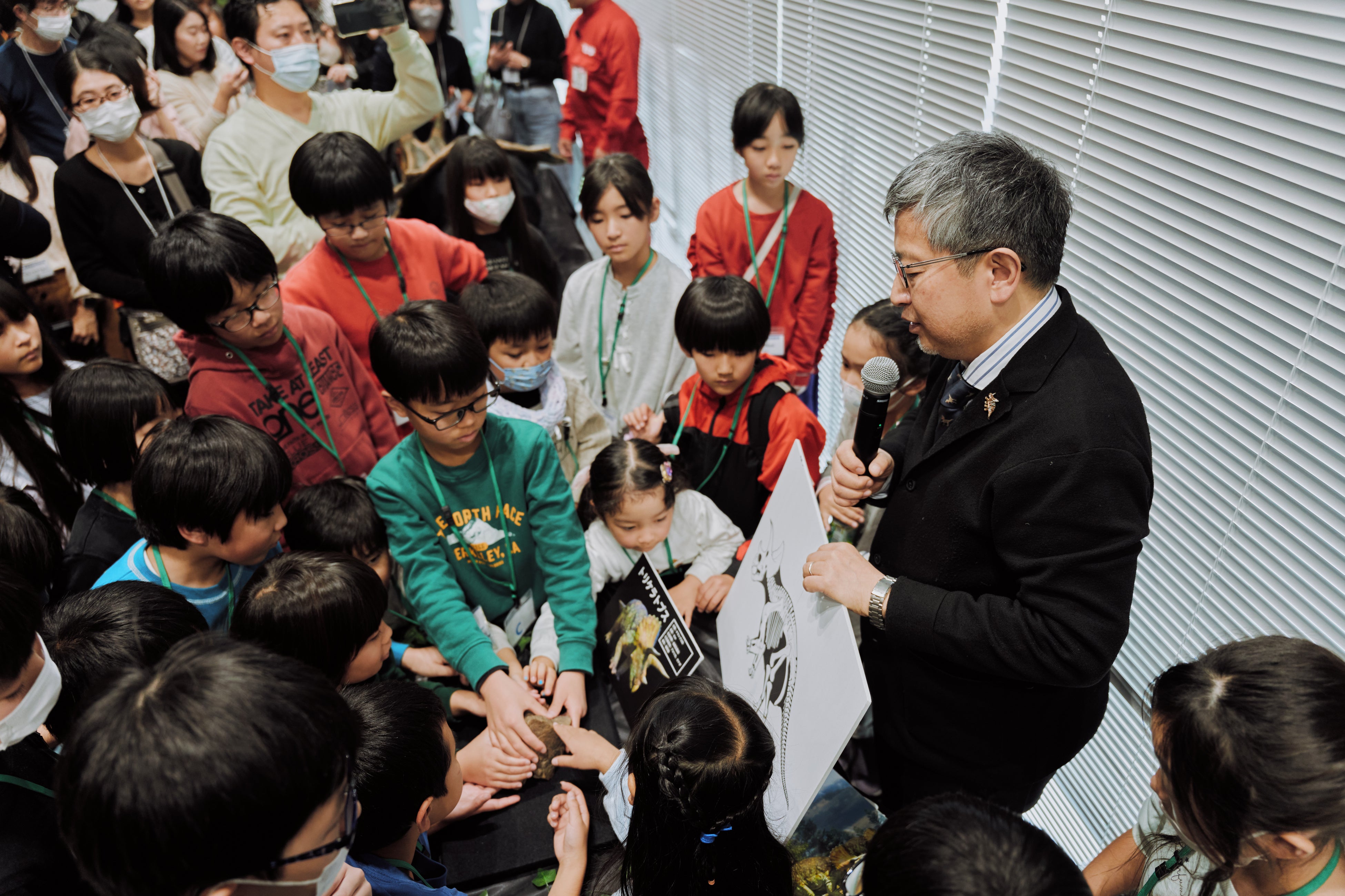 恐竜博士・真鍋 真先生が特別館長を務める、群馬県立自然史博物館からお借りした本物の化石や標本全6点を間近で見ながら、真鍋先生の生解説が聞けるスペシャルプログラム。子どもたちは化石の表面や形をじっくり観察。化石に触れて、凹凸や質感を肌で感じる体験も。教科書では分からない本物の手ざわりに、子どもたちは夢中になっていました。