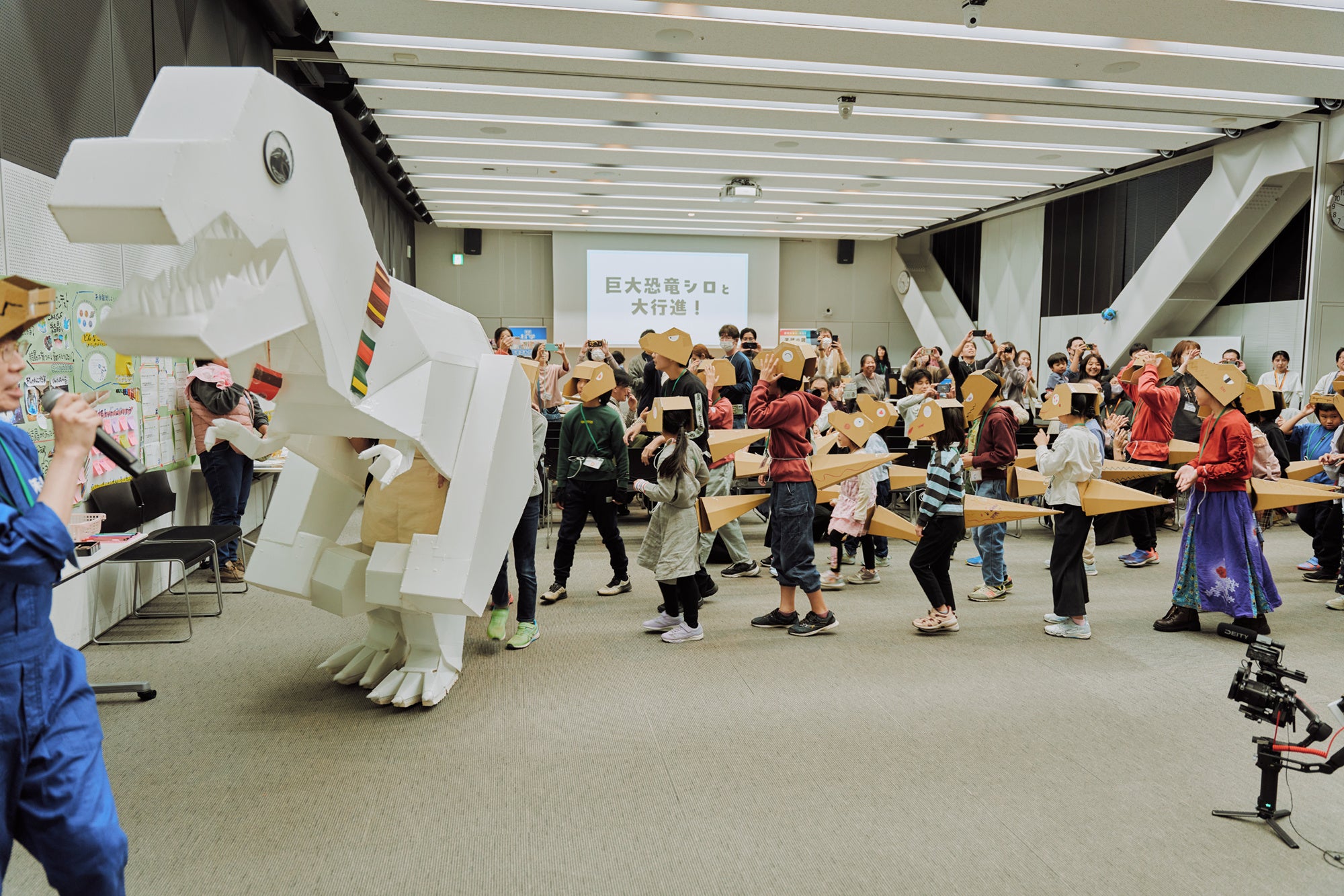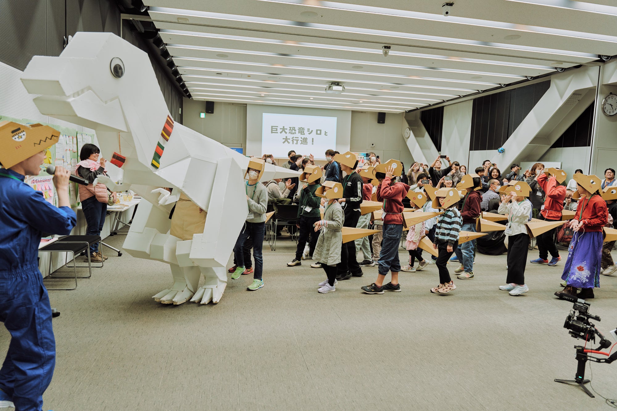 石川県金沢市在住の工作作家・ヒゲキタさんが作った、全長4.5mの巨大プラダン恐竜「うちのシロ」が会場に出現。子どもたちはダンボールのパーツを組み立て、“着られるティラノサウルス”を制作。できあがった恐竜はどれも個性たっぷり。最後は、音楽に合わせて全員で大行進をしました。