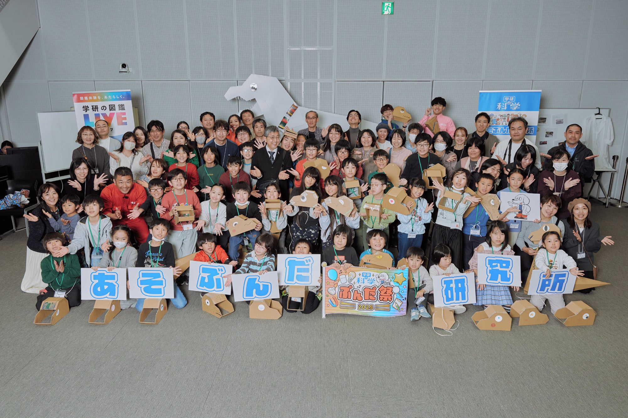 「ぶんだ祭2025」は学研本社ビル(東京都品川区)で開催され、コミュニティで活発に投稿している小学生を全国から招待。学研の科学最新刊「恐竜化石発掘キット」にちなんで、今回のテーマは恐竜。群馬県立自然史博物館から特別にお借りした本物の恐竜化石を目の前に、真鍋 真先生が生解説する博物館ツアー、着られるティラノサウルスをつくる工作ワークショップ、編集部による大実験ショーなど、大盛況の一日となりました。
