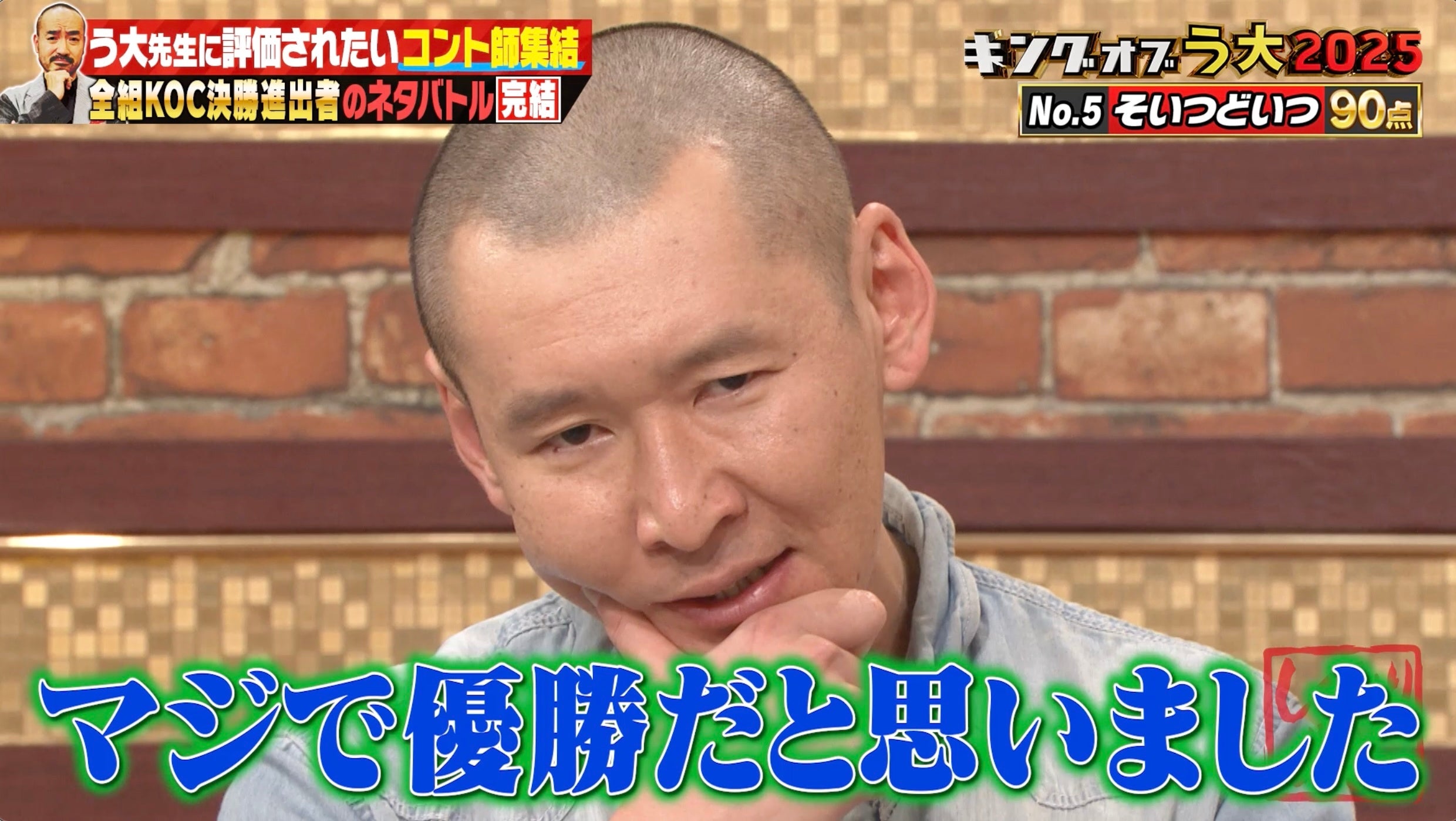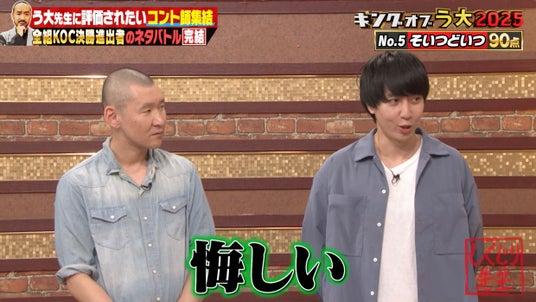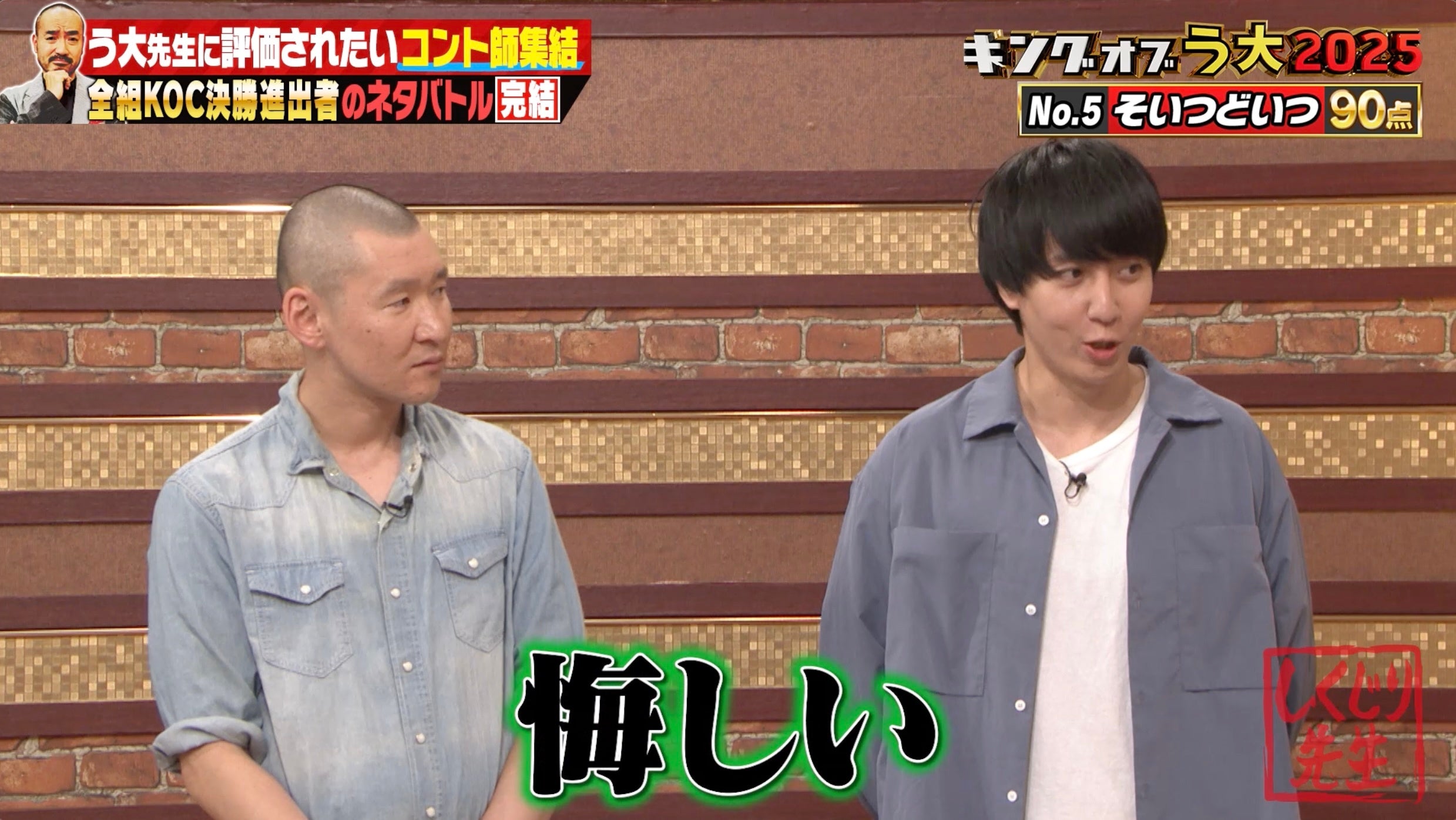続くそいつどいつは、心霊スポットに訪れた友人に“森の守り神”が憑依するというハイテンションなコントを披露。市川刺身の奇怪な動きと強烈なキャラクターにスタジオでは笑いの連続となりますが…。う大先生は「90点」と評価し、「刺身の動き、パワフルなおもしろさは良かった」と賛辞を送りつつ、「(市川の声色が)意外と音が入ってきづらい」「もっとノーストレスで見たいのに、“ちゃんと聞かないと”ってところがあってもったいない」と課題も提示。ツッコミの松本竹馬のキャラ設定や友人同士の関係性の変化、オリジナリティのあるやりとりを盛り込めるとより良くなるとアドバイスしたう大先生は、「めっちゃウケてるからいいんだけど、『キングオブう大』となった時にオレの中の基準で点を付けさせてもらいました」と語りました。う大先生の評価に、市川は「マジで優勝だと思いました」と手応えを感じていた本音を語り、松本も「悔しいです」とコメント。「もう途中から優勝だと思ってなかった?」「ウケてたもんね」というしくじり学園メンバーの声に、松本は「ちょっと照れて笑っちゃったりしてました」、市川も「キンオブう大むじぃ」と答え、笑いを誘いました。