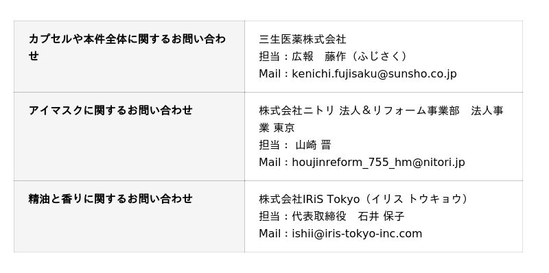 - 三生医薬:IRiS Tokyoが設計した天然精油ブレンドを、独自の高密封シームレスカプセル(※1)に封入。精油の鮮度を保ち、宇宙環境でも安全かつ安定的に機能させるカプセル製造技術を提供。- ニトリ:吸湿発熱素材「Nウォーム」を活用し、香り×温もりを調和させることで、心地よい睡眠環境の提供を狙う。
