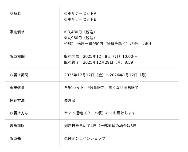 d130004-117-c3c608c955e2948e4f791b055129ca8b.pdf 楽彩株式会社(本社:東京都足立区/代表取締役社長:大崎善保)は、クリスマスや年末年始のホームパーティーを華やかに彩る『RAKUSAIホリデーセット』を、2025年12月8日(月)より販売開始いたします。