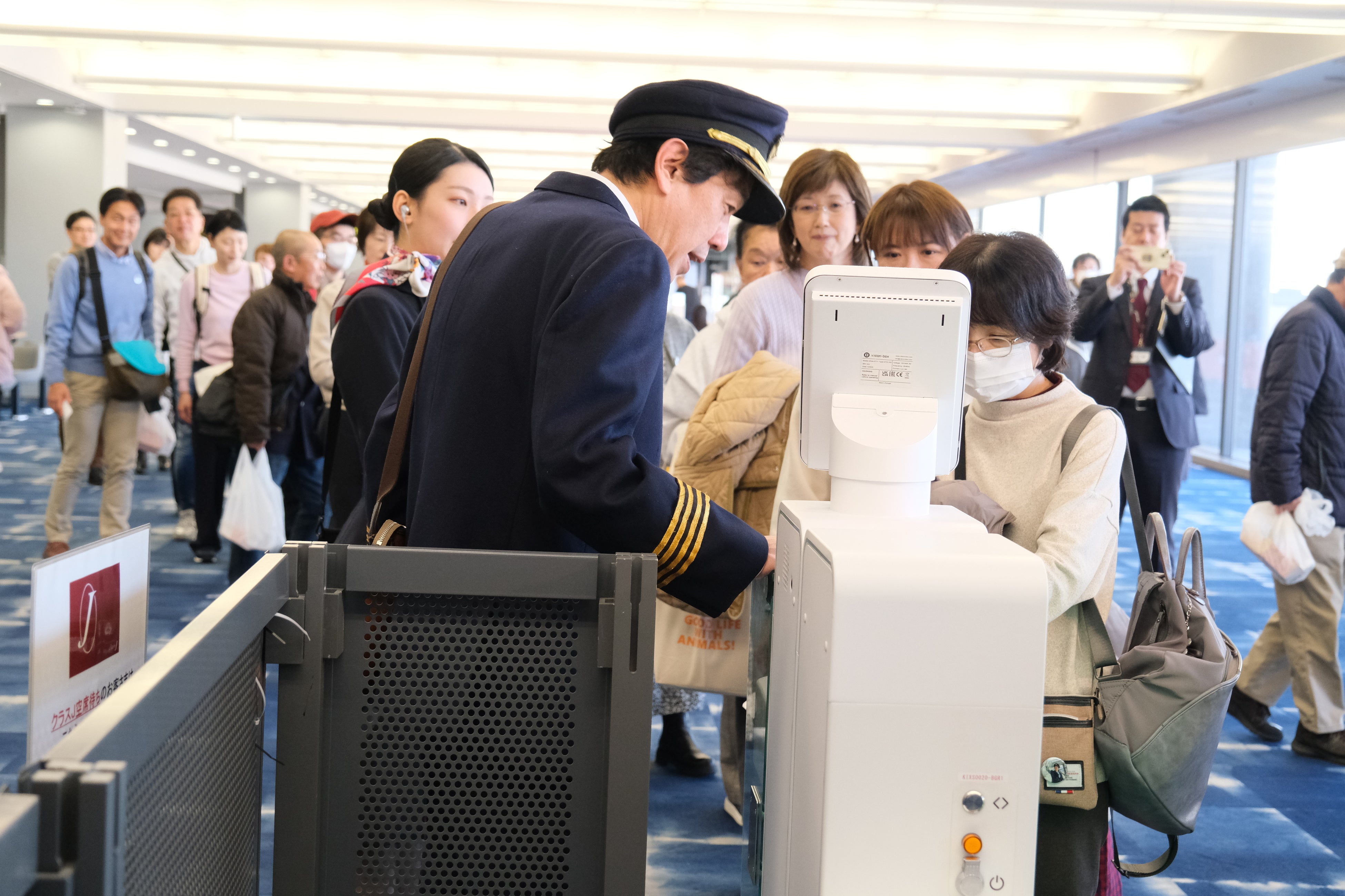 搭乗ゲートの電光掲示板には普段では見ることのない【大阪(関西)行】の文字。機体は番組5周年に合わせて「JL5555」と掲示された。