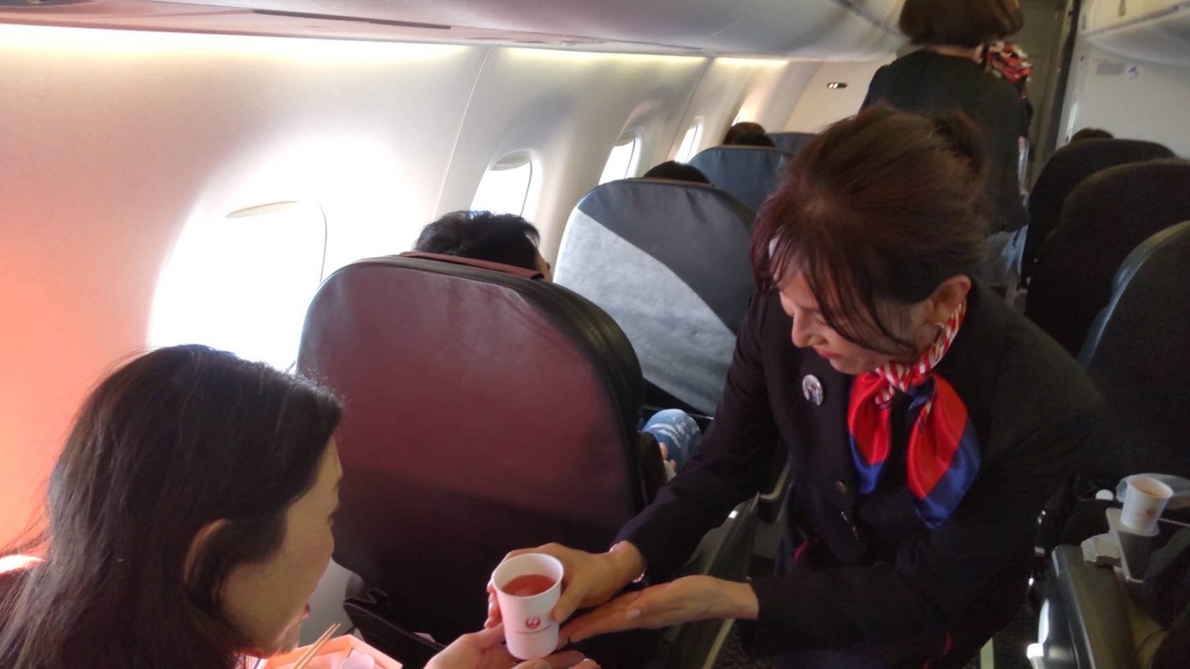 「エアボーン!」の大きな掛け声に合わせて離陸し、機内では浦川・杉本がドリンクサービスを行い、皆様をもてなした。