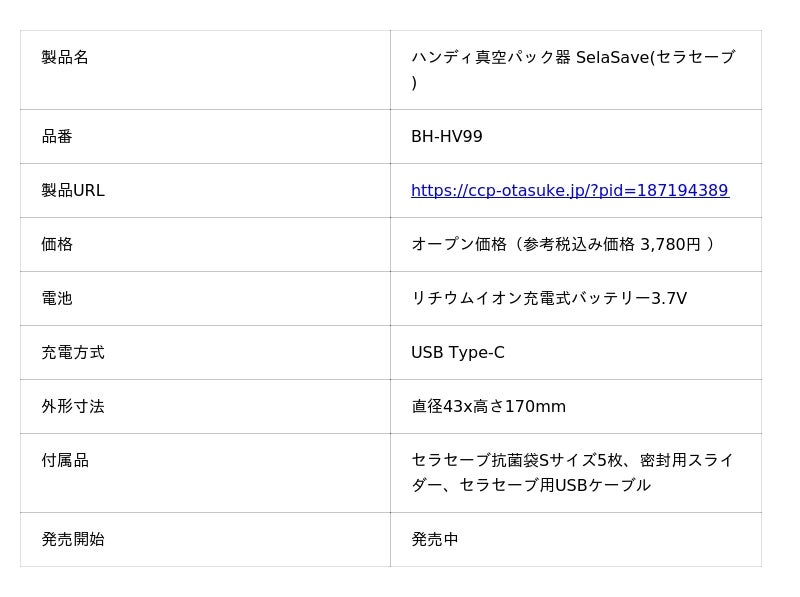 ■『ハンディ真空パック器 SelaSave(セラセーブ)』製品概要