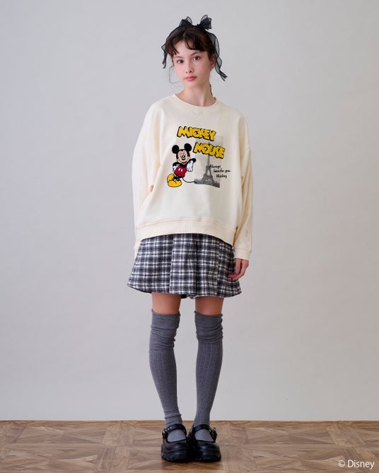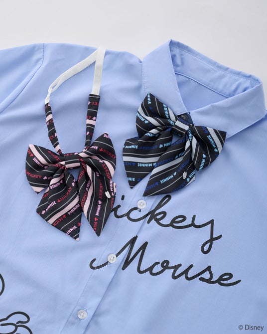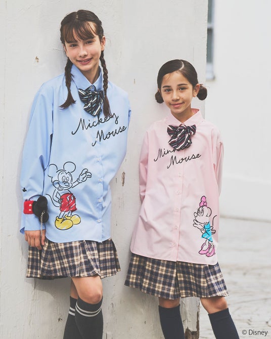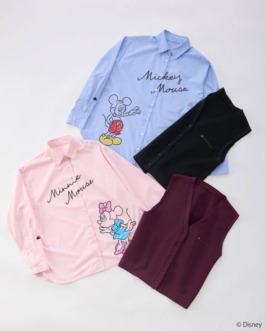 ブルーにはミッキー、ピンクにはミニーのアートをあしらったシャツとニットベストのセットアイテム。ゆったりめのシャツは動きやすく快適、ニットベストを重ねればきちんと感もプラスされ、休日のお出かけにもぴったりです。