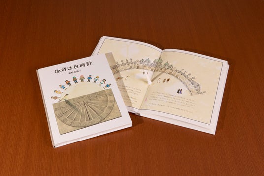 『地球は日時計』は、小学生向けの月刊かがく絵本「たくさんのふしぎ」の1985年11月号として刊行された作品です。月刊絵本での刊行時は、しかけを自作する仕様でしたが、今回はしかけが飛び出す絵本にしており、絵本を開くと「日時計」が立ち上がり、地球の自転や公転といった知識として知ってはいても体感することは難しい「地球そのものの運動」を体験できます。