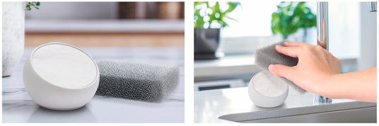限られた時間を効率的に、心地よく過ごしたい。サンサンウォッシュは、そんな現代の暮らしに応えるために生まれました。軽くタッチするだけで高い洗浄力を発揮する固形洗剤は、肌の弾力や潤いを守るコラーゲンや保温効果の高い温泉成分をたっぷり配合されているため手肌へも優しく、毎日の食器洗いを手軽で快適なものにします。シンクにそっと佇み、馴染むデザインは、キッチンの景観を損ねません。
