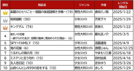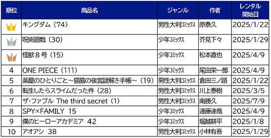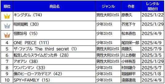 株式会社ゲオホールディングス(本社:愛知県名古屋市中区、代表取締役社長執行役員:遠藤結蔵)のグループ会社である株式会社ゲオストア(本社:愛知県名古屋市中区、代表取締役社長:濱野敏郎)は、2025年1月1日から2025年11月15日までの期間を対象に、全国の約700店舗のゲオショップにおけるコミックレンタル数量を集計した年間ランキングを発表します。