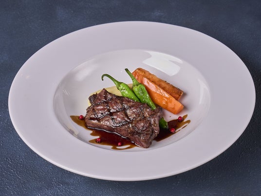 ・ リブアイステーキ 赤ワインソース グリル野菜とトリュフ風味マッシュポテト添え