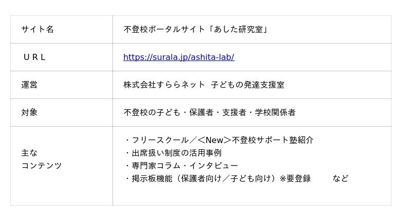 AIを活用したアダプティブな対話式 ICT 学習教材の開発と提供を行う株式会社すららネット(本社:東京都千代田区、代表取締役:湯野川孝彦)は、不登校の子どもや保護者・支援者を支えるポータルサイトサイト「あした研究室」において、新たに「不登校サポート塾」の掲載を開始しました。従来のフリースクール情報に加え、不登校の子どもたちを受け入れ、学びを軸に再スタートを支える学習塾の取り組みを紹介します。