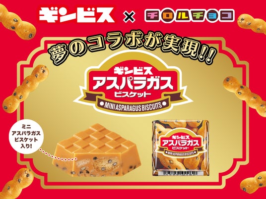 長年愛されてきたロングセラーのスティック型ビスケット「アスパラガスビスケット」とチロルチョコがコラボ!相互コラボで「しみチョコミニアスパラガスきなこもち風」を株式会社ギンビスからも発売♪ロングセラー商品同士の夢のコラボです。
