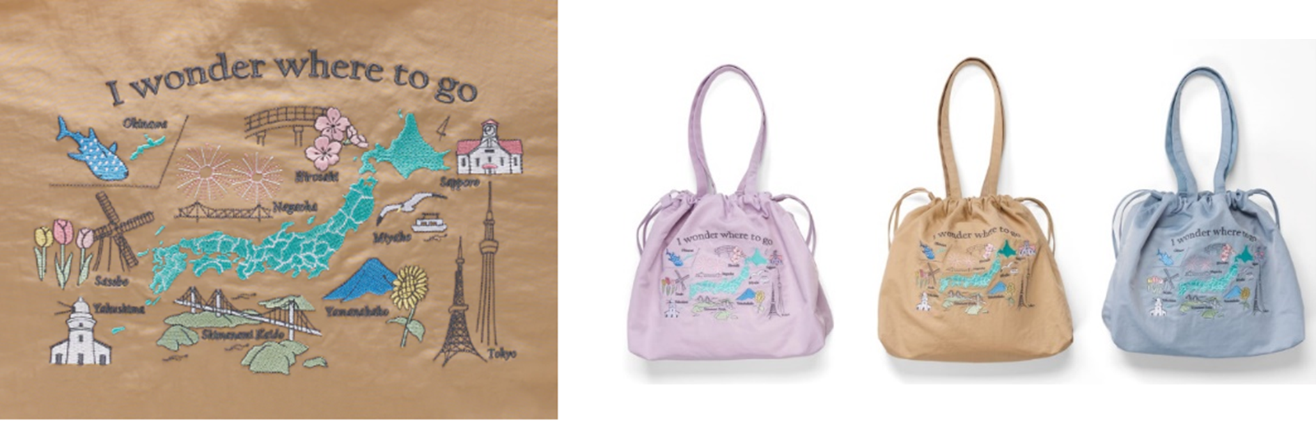 ▲(左より)ドローストリングバッグの刺繍デザインと3色のデザイン イメージ オンラインストア及び店舗で購入可能 ※ベージュのみ店舗限定販売