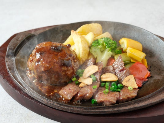 肉好きの心を満たす贅沢コンビ。人気の黒毛和牛ミニハンバーグをミニサイズで楽しめるうえ、旨みがギュッと詰まったハラミのカットステーキも添えた、既存店でもファンの多い人気メニューです。ソースは定番のデミグラスをはじめ、数種類からチョイス可能。