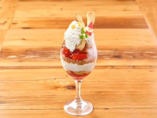 主役はみずみずしい“いちご”。ひと口食べると、紅茶のジュレのすっきりした香りと、シナモンやナツメグ香る洋梨のコンポートがふわりと広がり、甘さの中に上品な余韻が残る大人の味わいに仕上げました。フィアンティーヌのサクサク食感や、添えたパイをディップして楽しむ遊び心など、層ごとに表情が変わる“ときめき”が詰まった一杯です。見た目のボリュームに反して、食後感は驚くほど軽やか。お食事の後でもぺろりと召し上がれるのが嬉しいポイント。単品はもちろん、カフェと一緒に楽しめるドリンクセットもご用意しています。