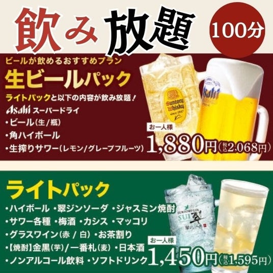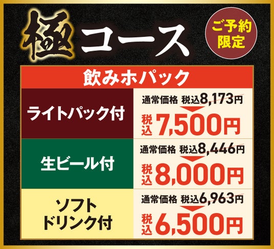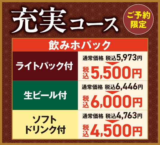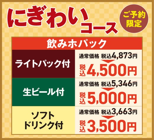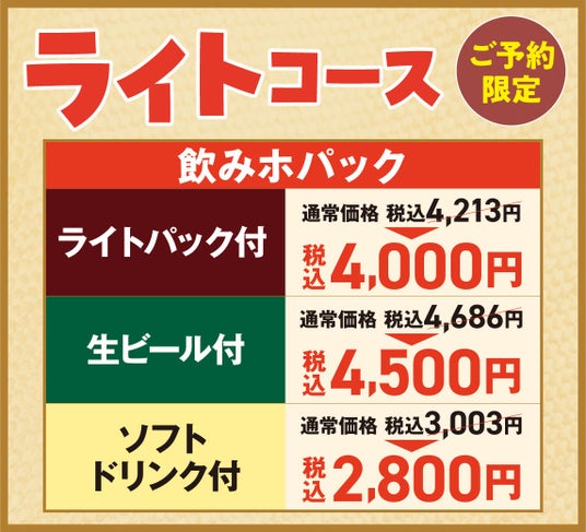 ご予約でお得な飲みホパックは「生ビールパック」「ライトパック」付きコースで