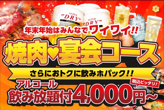 今年の忘新年会は、会社も、家族も、地元の集まりも。みんなで乾杯、焼肉で盛り上がろう!