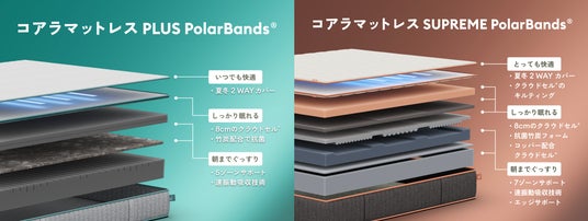 「コアラマットレス PLUS PolarBands(R)」119,900円(シングル)~、「コアラマットレス SUPREME PolarBands(R)」169,900円(シングル)~