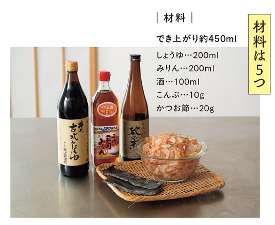 使うのは、しょうゆ、みりん、酒、こんぶ、かつお節の5つだけ 。1~3回作れば覚えられるほど簡単な手順で 、誰でも手軽に作れます。自分で作るから、正真正銘の無添加です 。